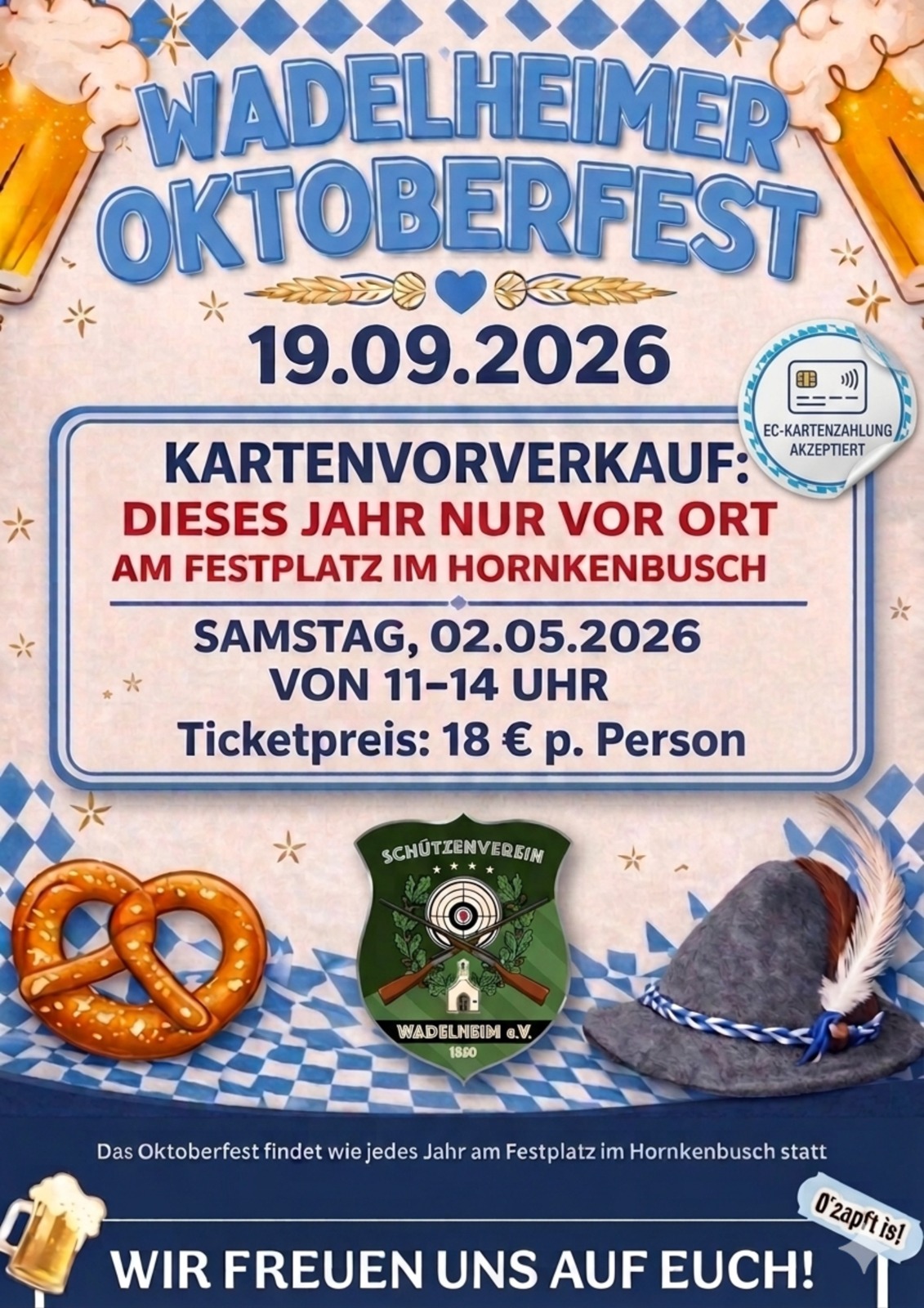 - Es können auch Karten per E-Mail unter kassierer@wadelheim.de bestellt und am zuvor genannten Termin gegen Barzahlung abgeholt werden.